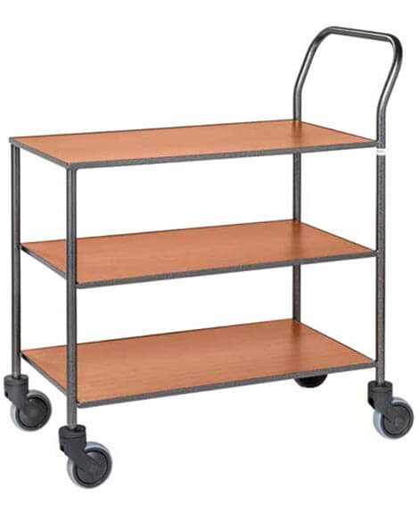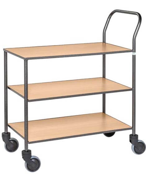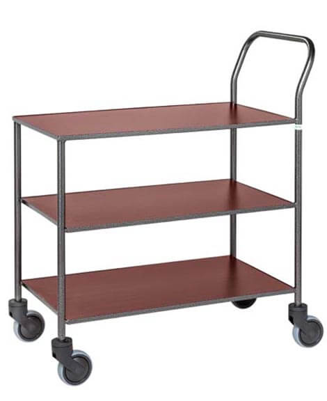 Pulverlakeret fuldsvejset antracitgrå stel med 3 laminat hylder. Robust serveringsvogn.