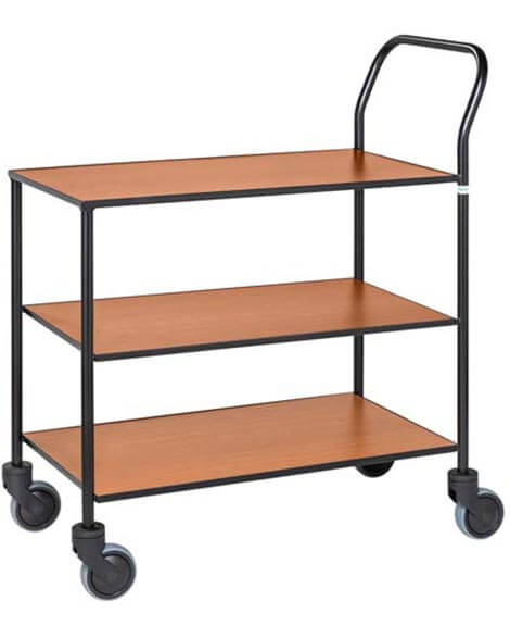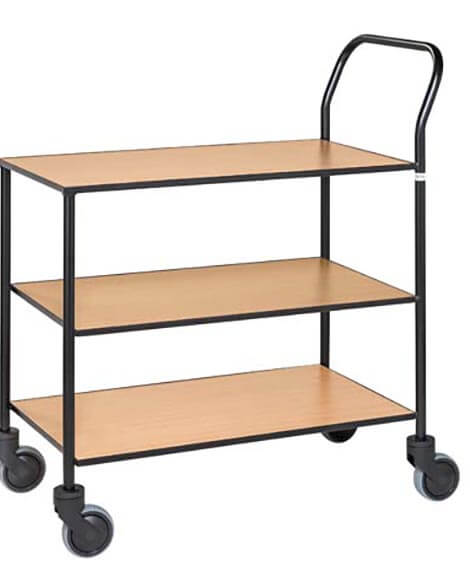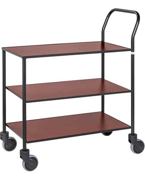 Pulverlakeret fuldsvejset sort stel med 3 laminat hylder. Robust serveringsvogn.