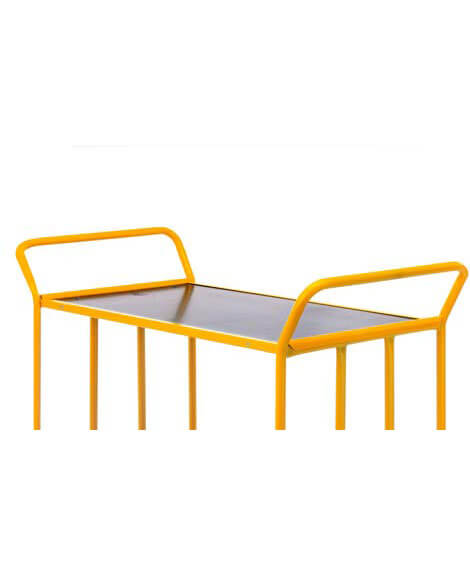 Gul, pulverlakeret platformsvogn, robust udført med lamineret hylde.