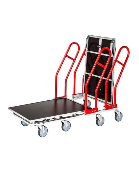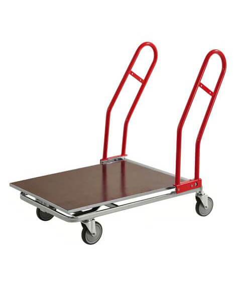 Volumenvogn med lasteplade i trådnet eller krydsfiner. Stablebare, vognene kan køres ind i hinanden.